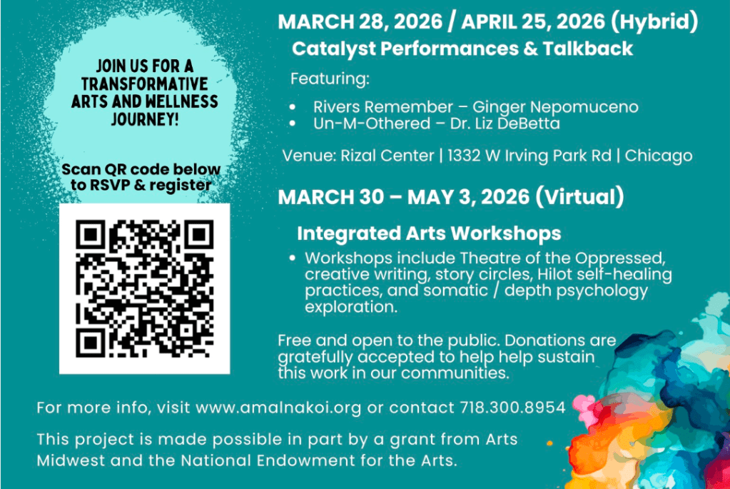 Arts Healing Across Communities is a six-month initiative in Chicago that brings together professional artists, community organizers, and marginalized groups to explore the power of the arts in advancing wellness and resilience. This project integrates KOI Institute’s mission-driven work in cultural organizing and Theater of the Oppressed with Liz DeBetta’s nationally recognized trauma-informed frameworks and Ginger Nepomuceno’s interdisciplinary work that weaves together Hilot (Filipino Indigenous healing), Kapwa Psychology, Depth and Archetypal Psychologies to guide individuals and communities through transformation and healing.