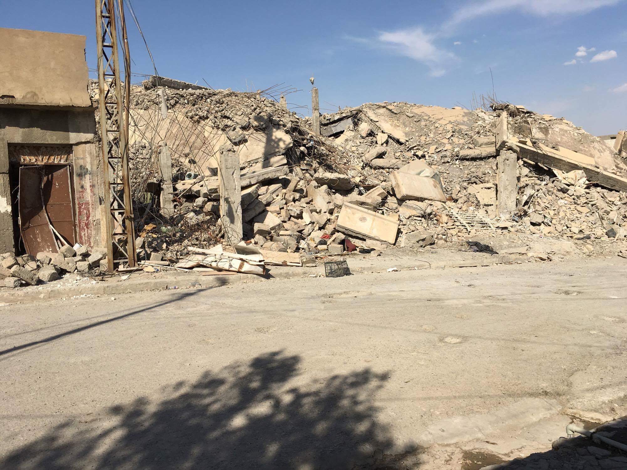 families affected by war. collapsed houses. small children walking 5 km. through rubble to reach school. mother with infant crosses the city on foot to the hospital.